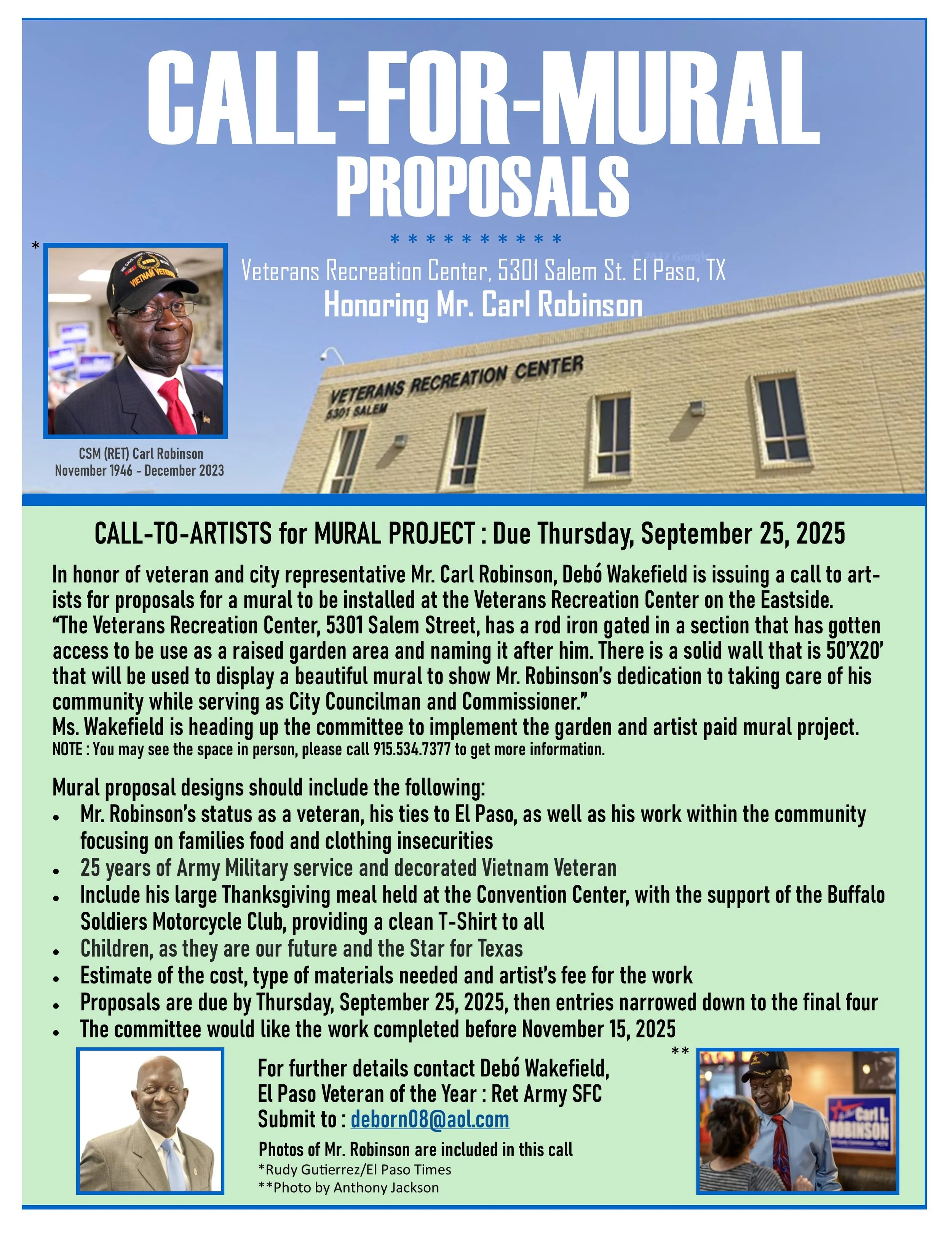 In honor of veteran and city representative Mr. Carl Robinson, Debó Wakefield is issuing a call to artists for proposals for a mural to be installed at the Veterans Recreation Center on the NORTHEAST.